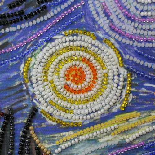 Набор для вышивки бисером на художественном холсте Звездная ночь харьковского производителя Абрис Арт кроме самого холста с нанесенной на него картиной и схемой содержит бисер (чешский Preciosa или японский Matsuno), бисерную иглу и инструкцию.