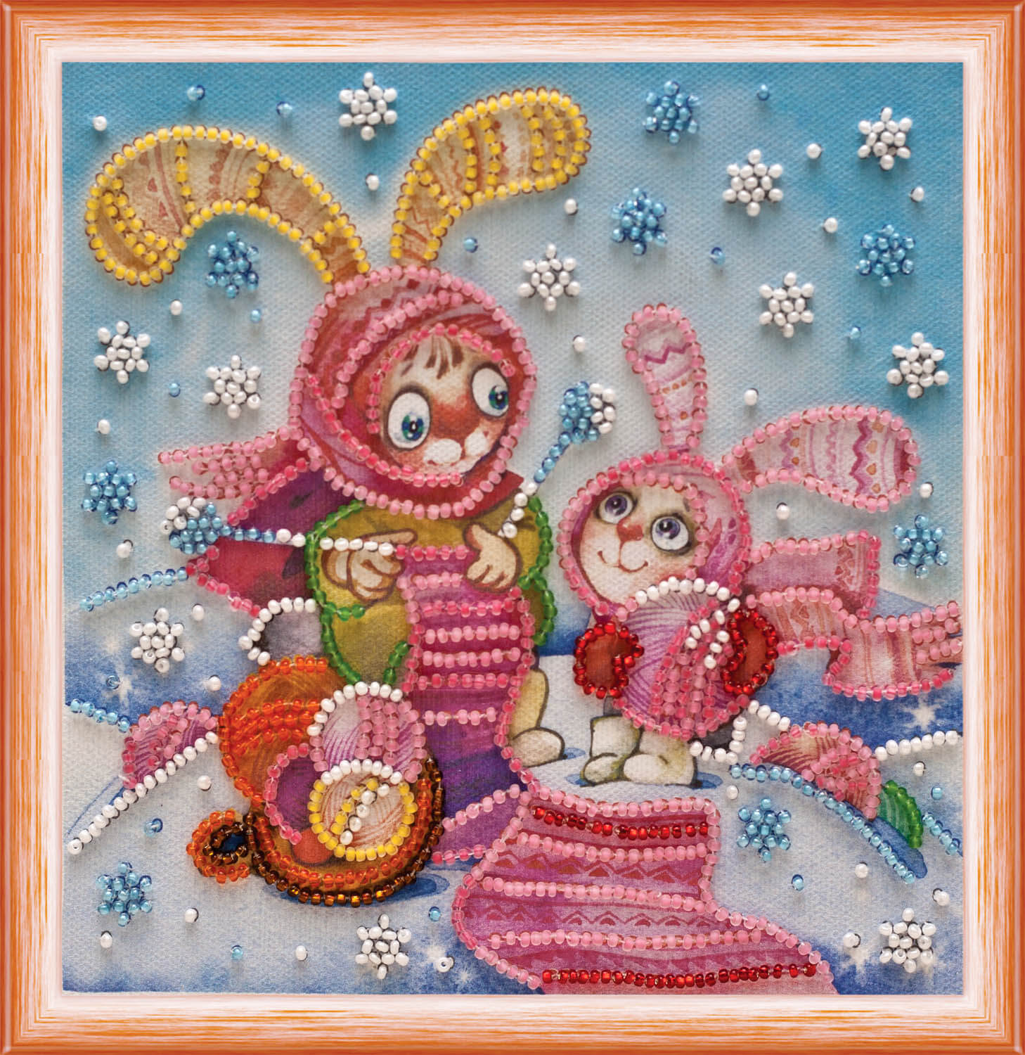 Набор для вышивания бисером на художественном холсте Зайки за вязанием, 150x150мм, AM-091, Абрис Арт