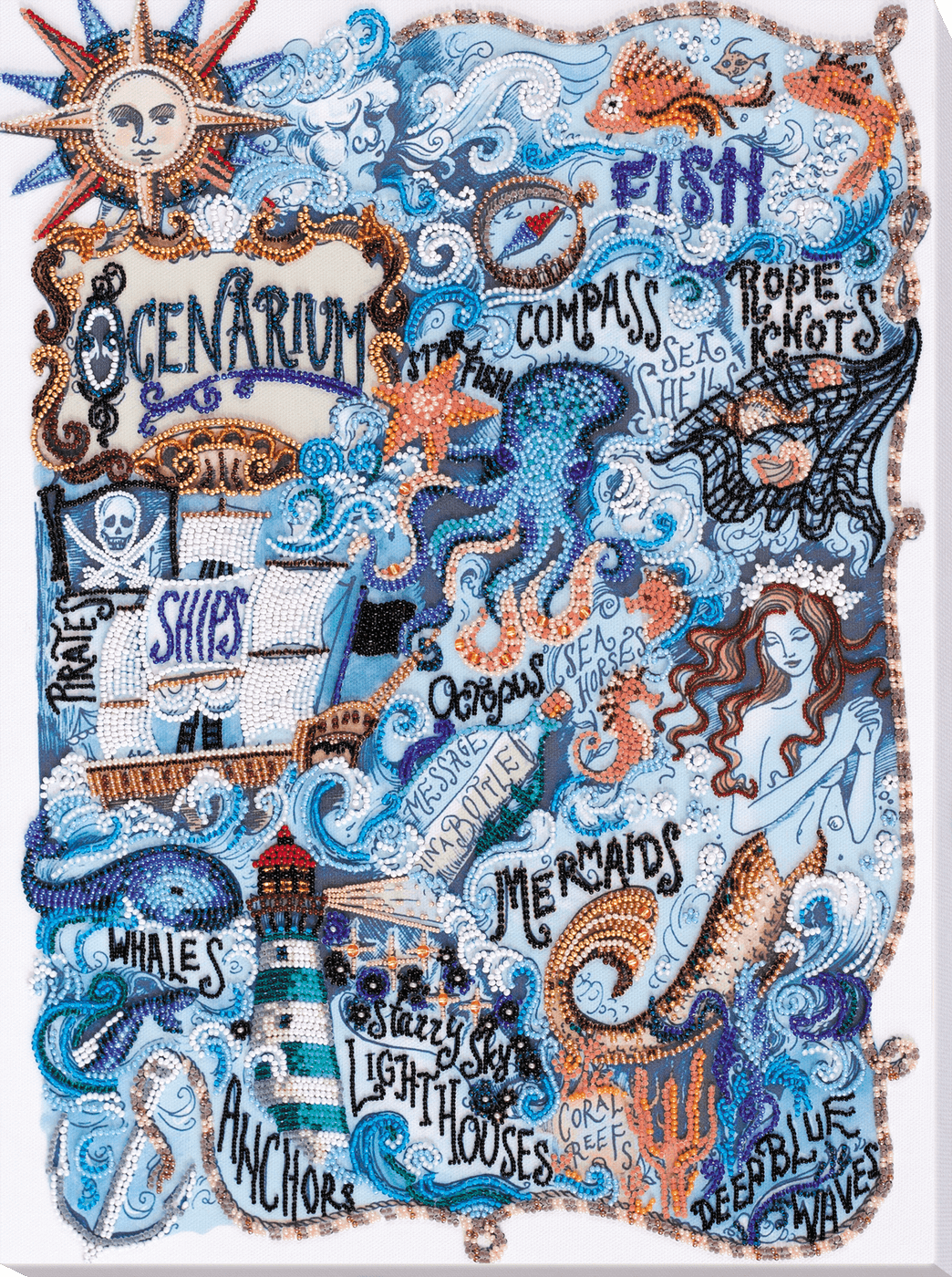Набор для вышивки бисером Тайны океана, AB-684, Абрис Арт (производство - Украина, Харьков) содержит схему, нанесенную акриловыми красками на художественный холст, чешский или японский бисер, бисерную иглу и инструкцию.