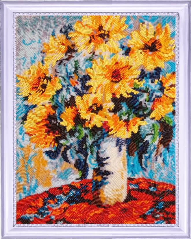 Набор для вышивания бисером с полной зашивкой Подсолнухи в вазе. По мотивам К. Моне, арт. bf138, ТМ Butterfly содержит атласную схему, бисер Preciosa (Чехия, 21 цвет), инструкцию и иглу для вышивания.