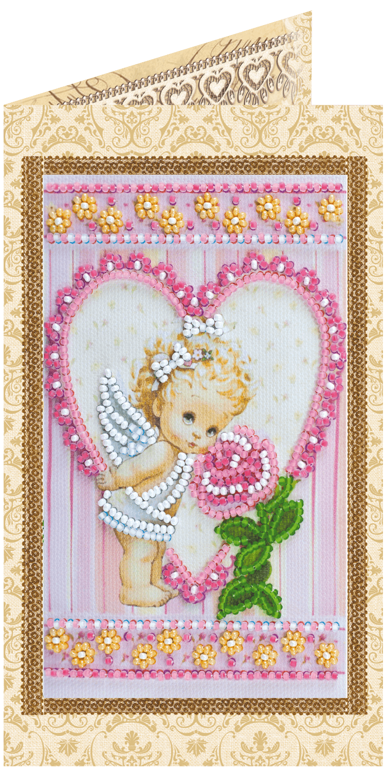 Набор для вышивки открытки бисером Ангелочек и роза (арт. AO-134) Абрис Арт содержит картонную открытку со вставкой художественного сукна, на которое нанесены рисунок и схема, бисер (Preciosa), бисерную иглу и инструкцию.