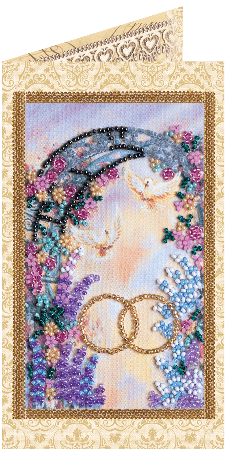 Набор для вышивки открытки бисером С днем бракосочетания-3 (арт. AO-111) Абрис Арт содержит картонную открытку со вставкой художественного сукна, на которое нанесены рисунок и схема, бисер (Preciosa), бисерную иглу и инструкцию.