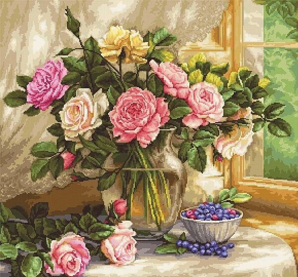 Набор для вышивания гобеленовым швом Натюрморт с голубикой (G588) компании Luca-S содержит изображение готовой работы, схему, мулине Anchor, канву Zweigart pointstich canvas, иглу и инструкцию на русском языке.