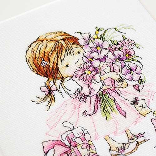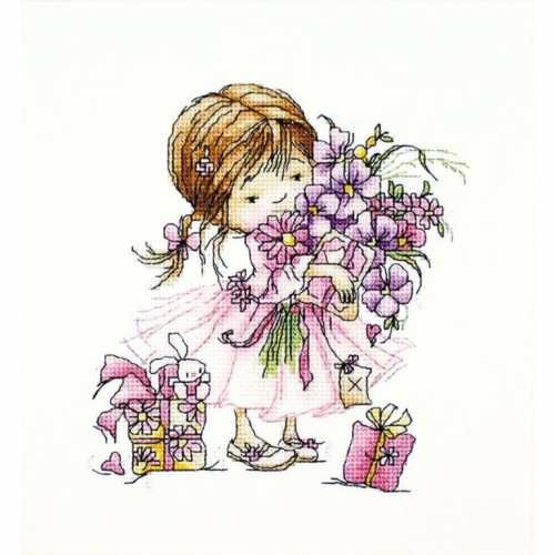 Набор для вышивки крестом Девочка с букетом компании Luca-S содержит изображение готовой работы, схему, мулине Anchor, канву Zweigart, иглу и инструкцию на русском языке.