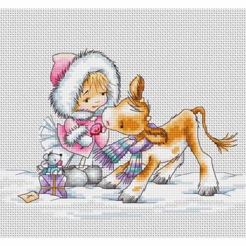 Набор для вышивки крестом Девочка с телёнком компании Luca-S содержит изображение готовой работы, схему, мулине Anchor, канву Zweigart, иглу и инструкцию на русском языке.