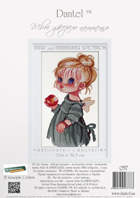 Набор для вышивания крестом Ангелочек с яблоком ТМ Dantel содержит мулине ПНК им. Кирова, канву Aida 14, символьную схему, иглу и инструкцию.