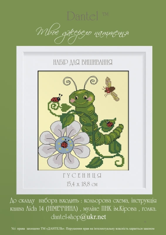 Набор для вышивания крестом Гусеница ТМ Dantel содержит мулине ПНК им. Кирова, канву Aida 14, символьную схему, иглу и инструкцию.