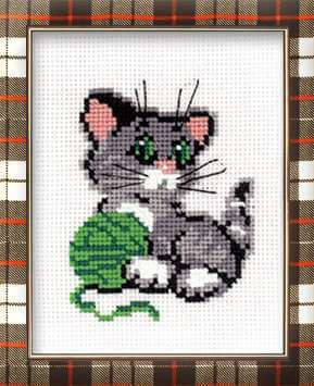 Набор для вышивания крестом Котенок с клубком (арт. Р-0375) ТМ Риолис содержит шерстяные нитки, канву (10 Aida Zweigart белая), иглу и подробную инструкцию.