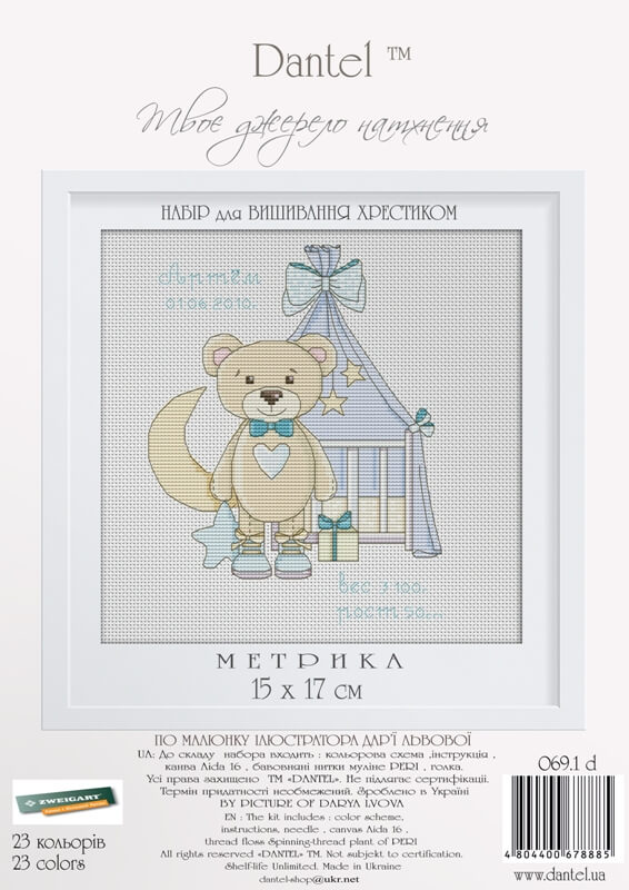 Набор для вышивания крестом Метрика Мальчик ТМ Dantel содержит мулине PERI, канву Aida 16, символьную схему, иглу и инструкцию.