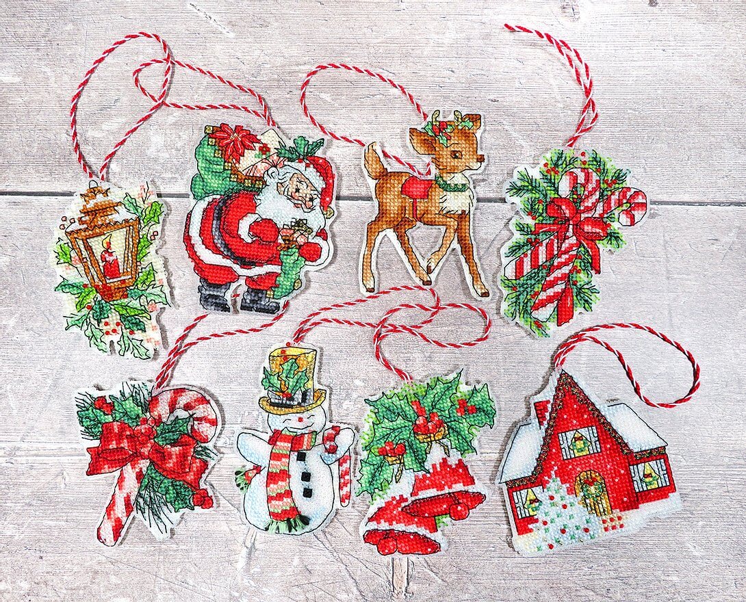 Набор для вышивки счетным крестом Набор новогодних игрушек №1 (LETI-966) компании Luca-S содержит изображение готовой работы, схему, мулине Anchor, Madeira Metallic, пластиковую канву, иглу и инструкцию на русском языке.