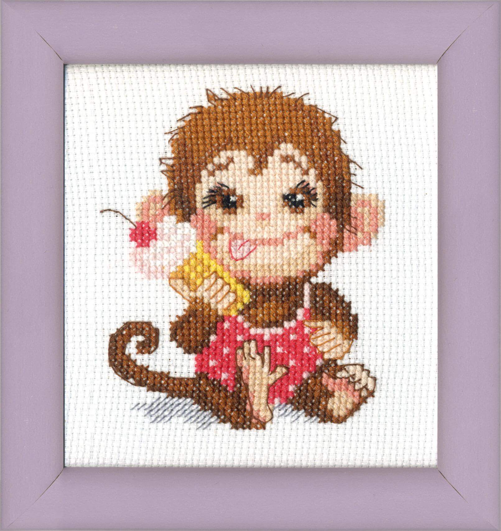 Набор для вышивания крестом Обезьянка-лакомка содержит подробную инструкцию и цветную символьную схему, канву Aida 14, х/б мулине Bestex - 13 цветов и иглу.