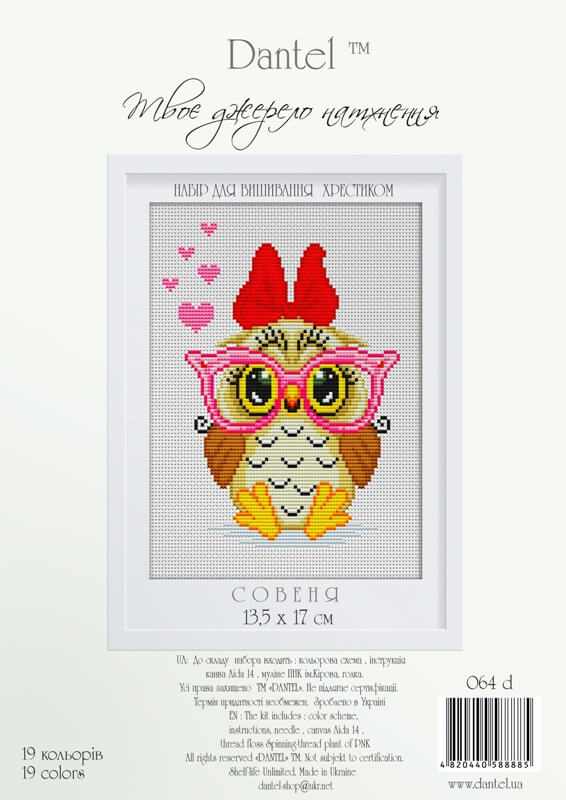 Набор для вышивания крестом Сова ТМ Dantel содержит мулине ПНК им. Кирова, канву Aida 14, символьную схему, иглу и инструкцию.