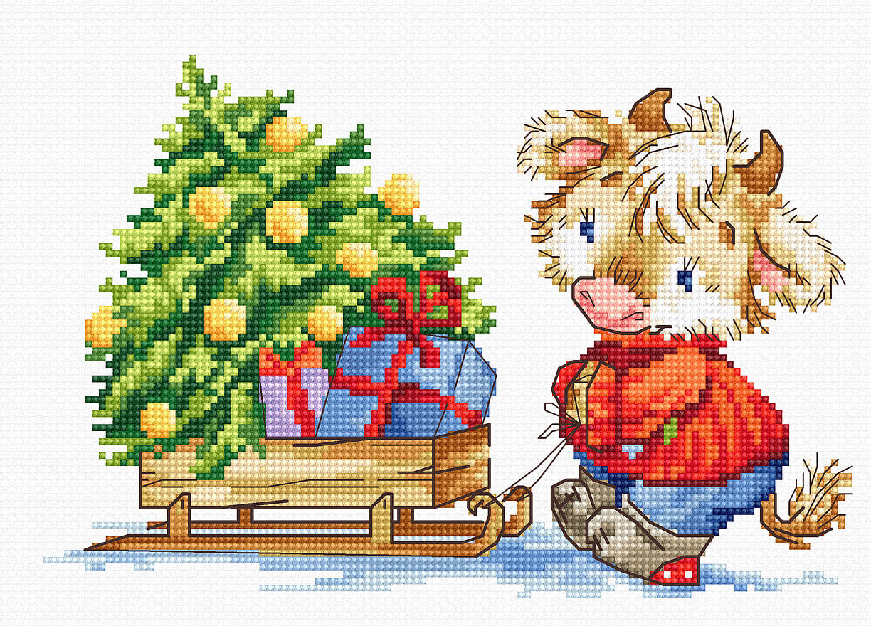 Набор для вышивки счетным крестом Телёнок с ёлкой (B1181) компании Luca-S содержит изображение готовой работы, схему, мулине Anchor, канву Zweigart Aida 16 ct., иглу и инструкцию на русском языке.
