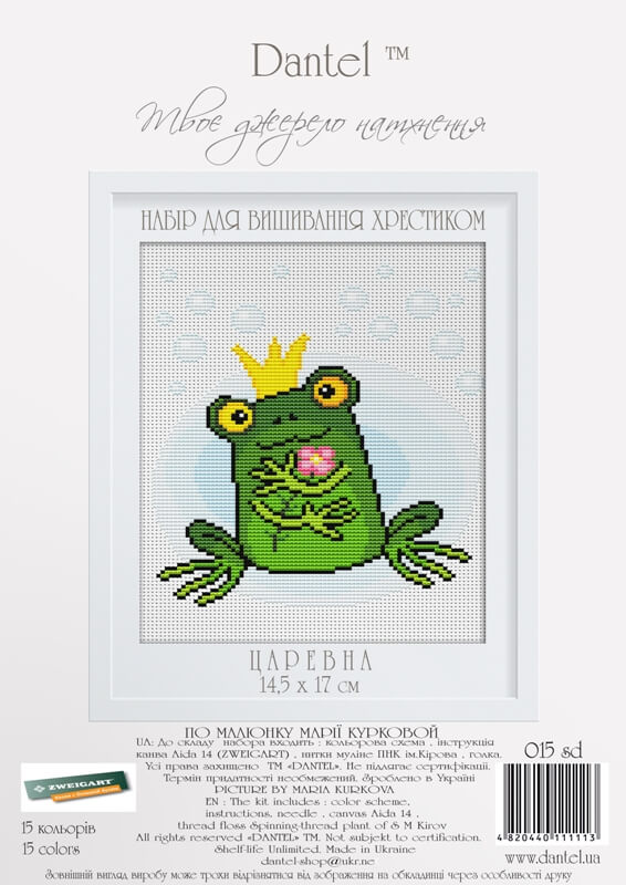 Набор для вышивания крестом Царевна ТМ Dantel содержит мулине ПНК им. Кирова, канву Aida 14, символьную схему, иглу и инструкцию.