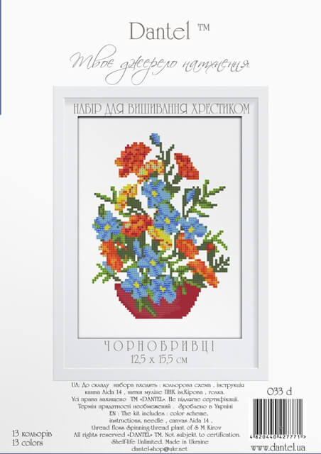 Набор для вышивания крестом Чернобривцы ТМ Dantel содержит мулине ПНК им. Кирова, канву Aida 14, символьную схему, иглу и инструкцию.
