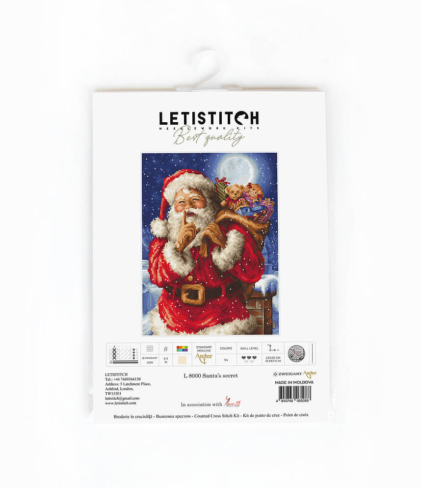 Набор для вышивки счетным крестом Santa’s secret, Секрет Санты (L8000) компании Luca-S содержит изображение готовой работы, схему, мулине Anchor, канву Zweigart 16, иглу и инструкцию на русском языке.