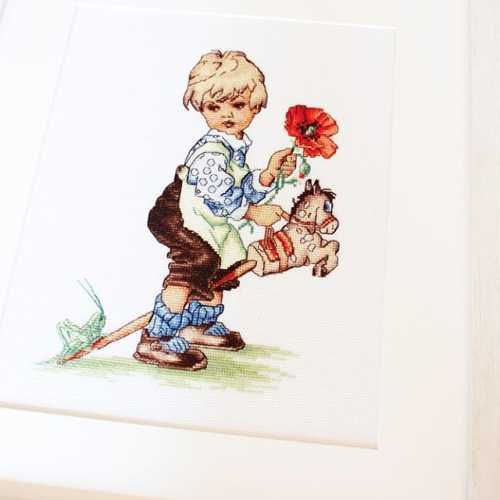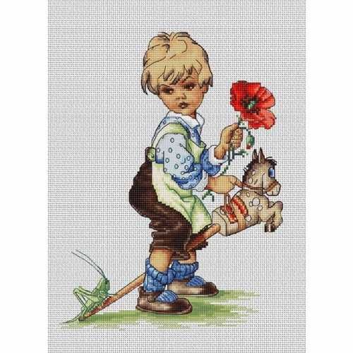 Набор для вышивки счетным крестом Мальчик (B1102) компании Luca-S содержит изображение готовой работы, схему, мулине Anchor, канву Zweigart Aida 16, иглу и инструкцию на русском языке.