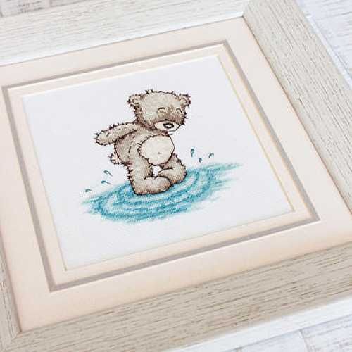 Набор для вышивки счетным крестом Медвежонок Бруно в луже (B1080) компании Luca-S содержит изображение готовой работы, схему, мулине Anchor, канву Zweigart Aida 16, иглу и инструкцию на русском языке.
