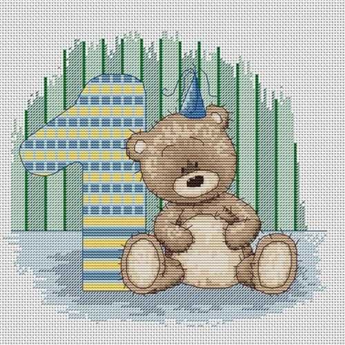 Набор для вышивки счетным крестом Медвежонок Бруно - День рождения (B1087) компании Luca-S содержит изображение готовой работы, схему, мулине Anchor, канву Zweigart Aida 16, иглу и инструкцию на русском языке.