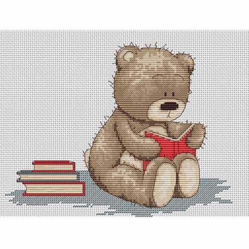 Набор для вышивки счетным крестом Медвежонок Бруно за учебниками (B1025) компании Luca-S содержит изображение готовой работы, схему, мулине Anchor, канву Zweigart Aida 16, иглу и инструкцию на русском языке.