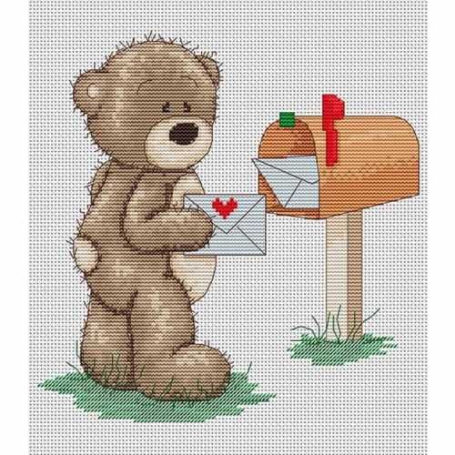 Набор для вышивки счетным крестом Медвежонок Бруно - Письмо (B1011) компании Luca-S содержит изображение готовой работы, схему, мулине Anchor, канву Zweigart Aida 16, иглу и инструкцию на русском языке.