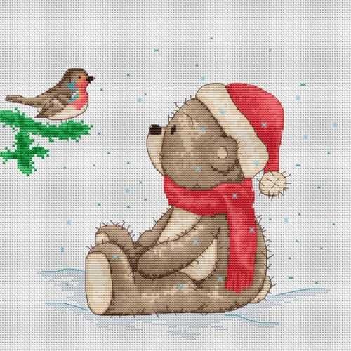 Набор для вышивки крестом Медвежонок Бруно компании Luca-S содержит изображение готовой работы, схему, мулине Anchor, канву Zweigart, иглу и инструкцию на русском языке.