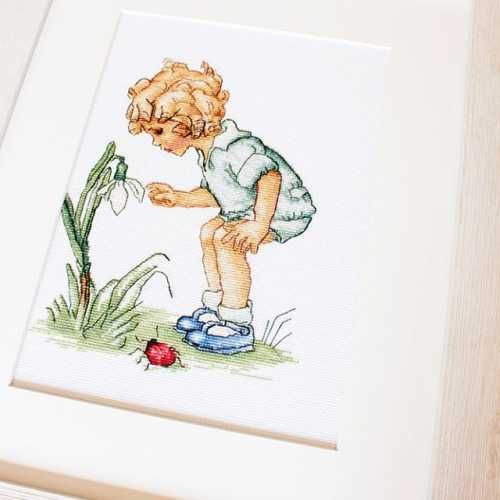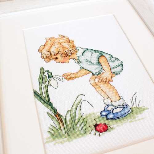 Набор для вышивки счетным крестом Подснежник (B1101) компании Luca-S содержит изображение готовой работы, схему, мулине Anchor, канву Zweigart Aida 16, иглу и инструкцию на русском языке.