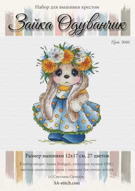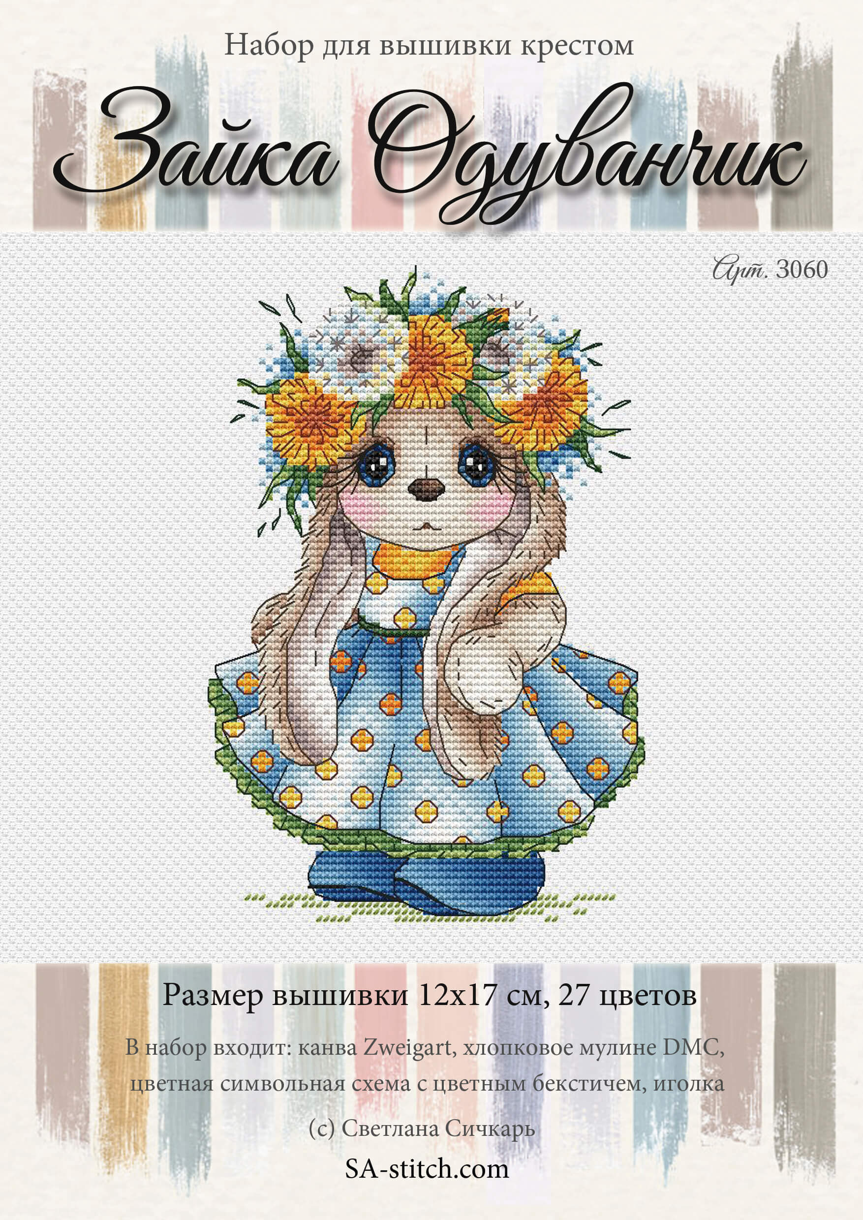 Набор для вышивки крестом Зайка Одуванчик, арт. 3060-SA, ТМ SA-stitch комплектуется белой канвой Zweigart Aida 14 или Linda 27 на выбор (укажите в комментариях при оформлении заказа), мулине DMC, символьной схемой и иглой.
