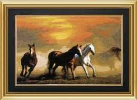 В набор для вышивки крестом Мустанг (размер вышивки 41.5x26.5см), арт. 501, ТМ Чарівна мить входит канва Aida 14, мулине ПНК им. Кирова, игла, цветная символьная схема и инструкция.