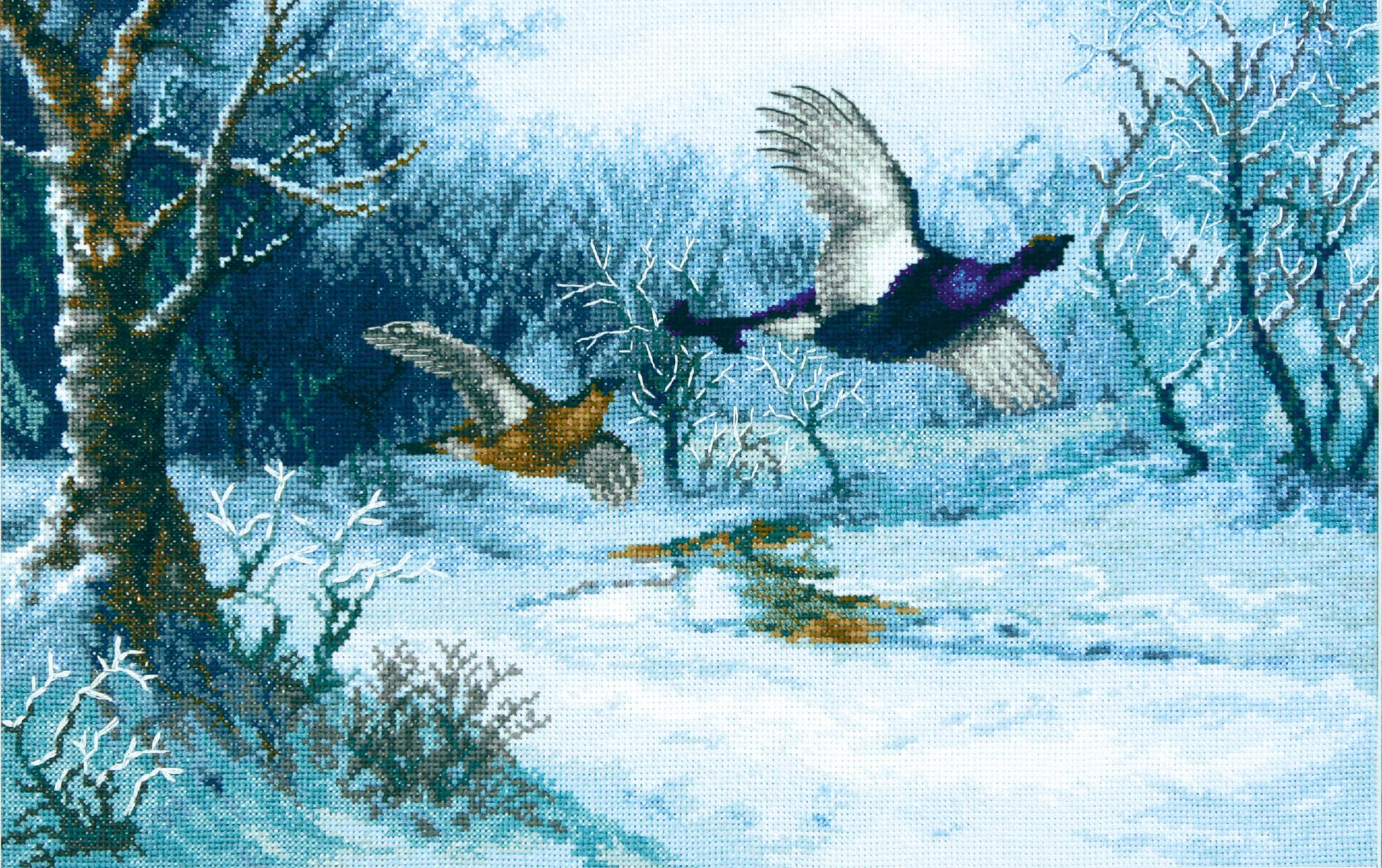 В набор для вышивки крестиком Полёт над серебристым ручьём, М-428, ТМ Чарівна мить входит ткань Aida 14 Zweigart, мулине Madeira (31 цвет), игла, цветная символьная схема и инструкция.