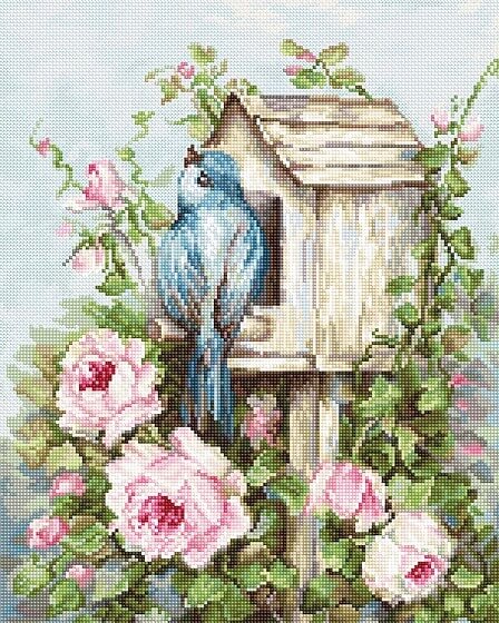 Набор для вышивки счетным крестом Птичий дом и розы (B2352) компании Luca-S содержит изображение готовой работы, схему, мулине Anchor, канву Zweigart Aida 18 ct. (100), иглу и инструкцию на русском языке.