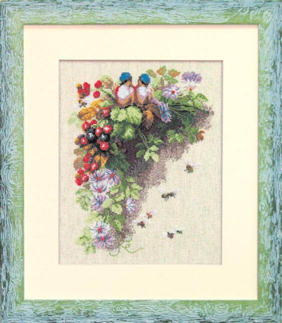 В набор для вышивки крестом Птички в ежевике (размер вышивки 20x25см), арт. 583, ТМ Чарівна мить входит канва Aida 16, мулине ПНК им. Кирова, игла, цветная символьная схема и инструкция.