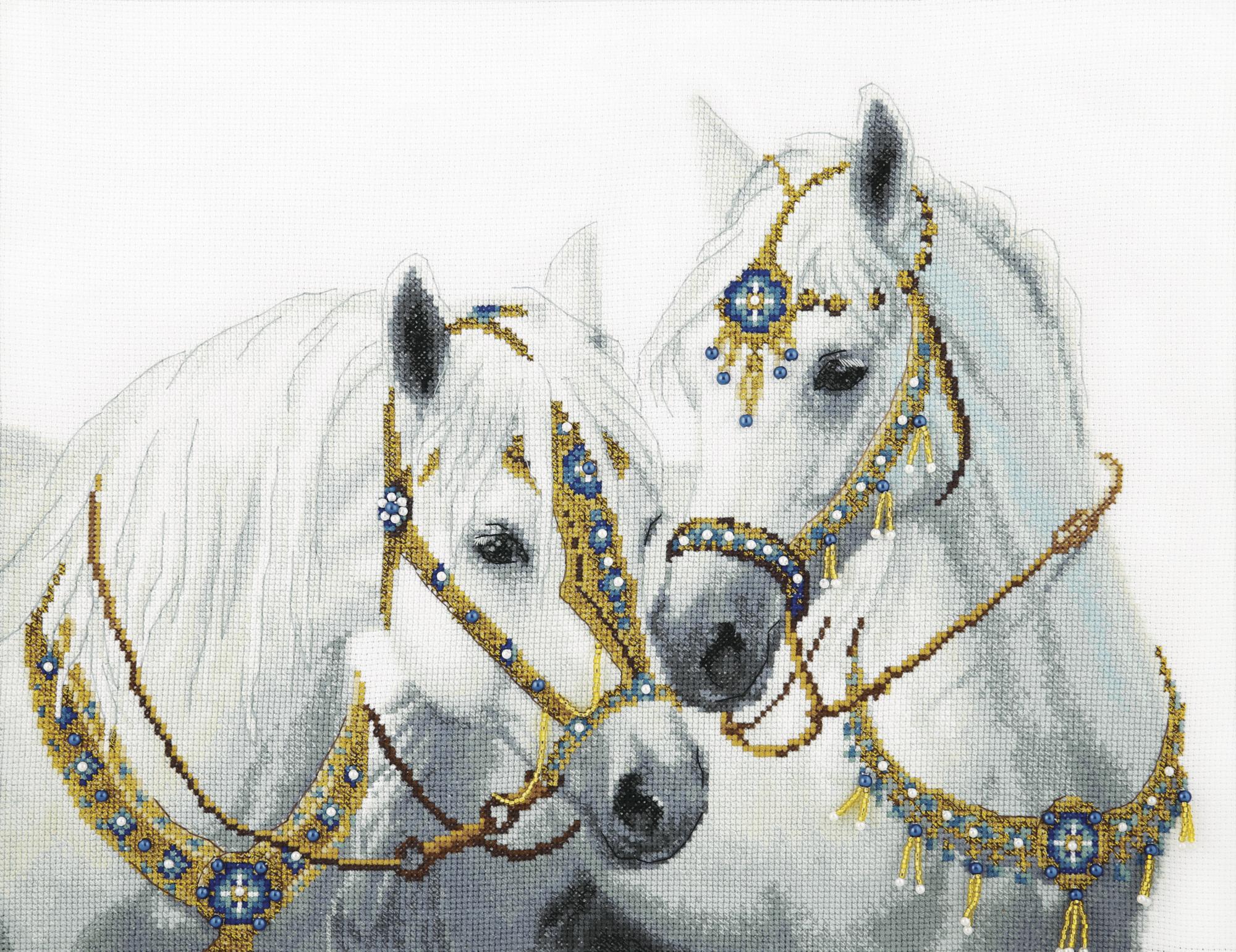 В набор для вышивки крестиком Свадебные лошади, М-426, ТМ Чарівна мить входит канва Aida 14, мулине Madeira (22 цветов), чешский бисер Preciosa Ornela (3 цвета), иглы, цветная символьная схема и инструкция.