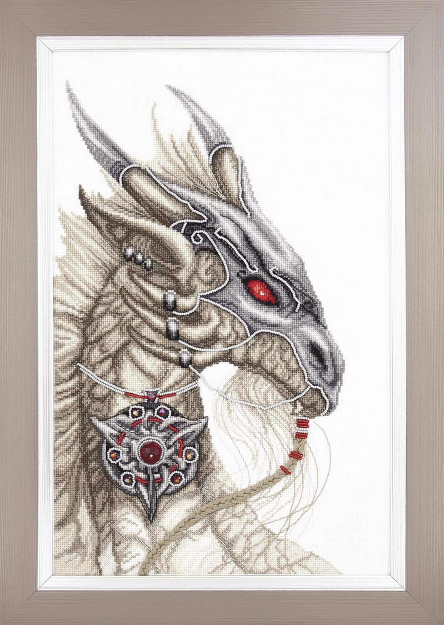 Набор для вышивания Страж сокровищ содержит подробную инструкцию вместе с цветной символьной схемой, канву Aida 16, нитки мулине Madeira - 13 цв., бисер Preciosa - 3 цв., бусины Crystal Art - 2 цв. и иглы. Размер вышивки 28х44см.