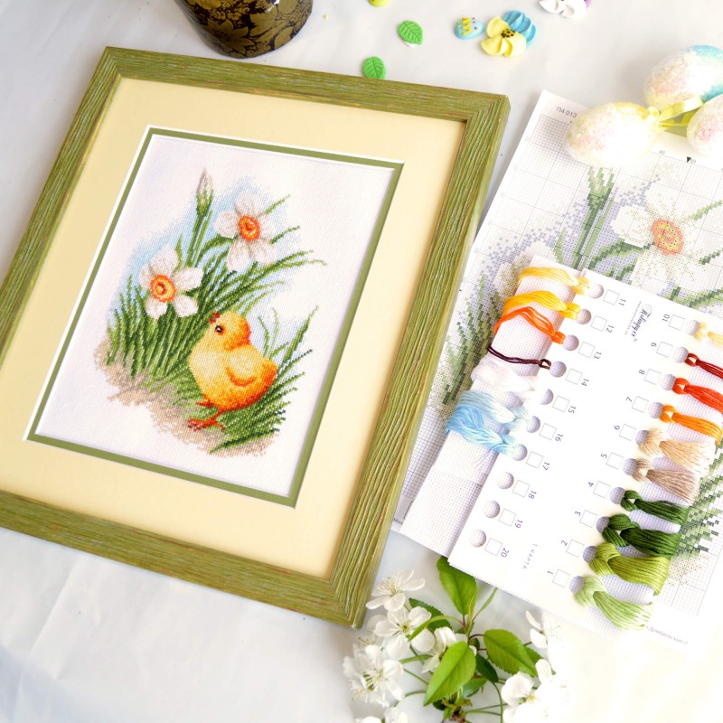 В состав набора для вышивки крестом Цыпленок киевского производителя Повитруля входит белая канва Aida 16, мулине ПНК им.Кирова, цветная схема и игла.