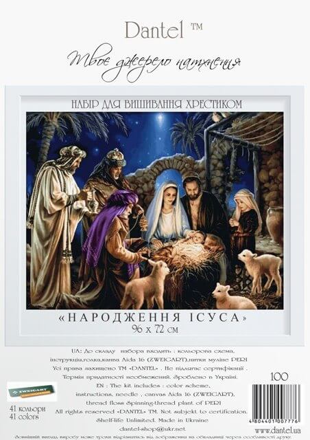 Набор для вышивания крестом Рождение Иисуса ТМ Dantel содержит мулине DMC, канву Aida 16, символьную схему, иглу и инструкцию.