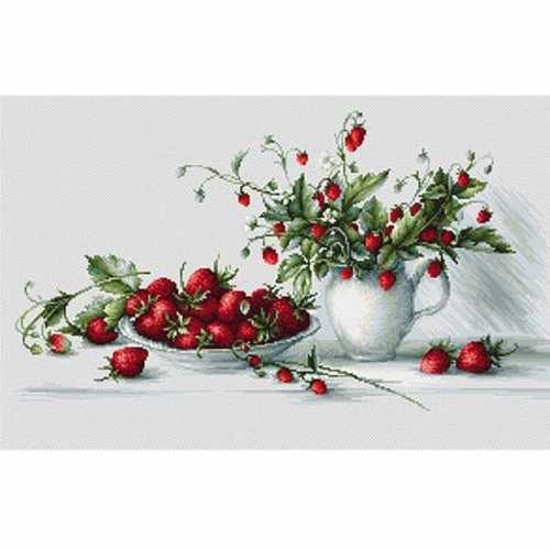 Набор для вышивки счетным крестом Клубника (B2277) компании Luca-S содержит изображение готовой работы, схему, мулине Anchor, канву Zweigart Aida 18, иглу и инструкцию на русском языке.