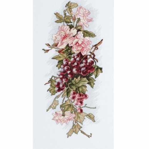 Набор для вышивки крестом Композиция с виноградом компании Luca-S содержит изображение готовой работы, схему, мулине Anchor, канву Zweigart, иглу и инструкцию на русском языке.