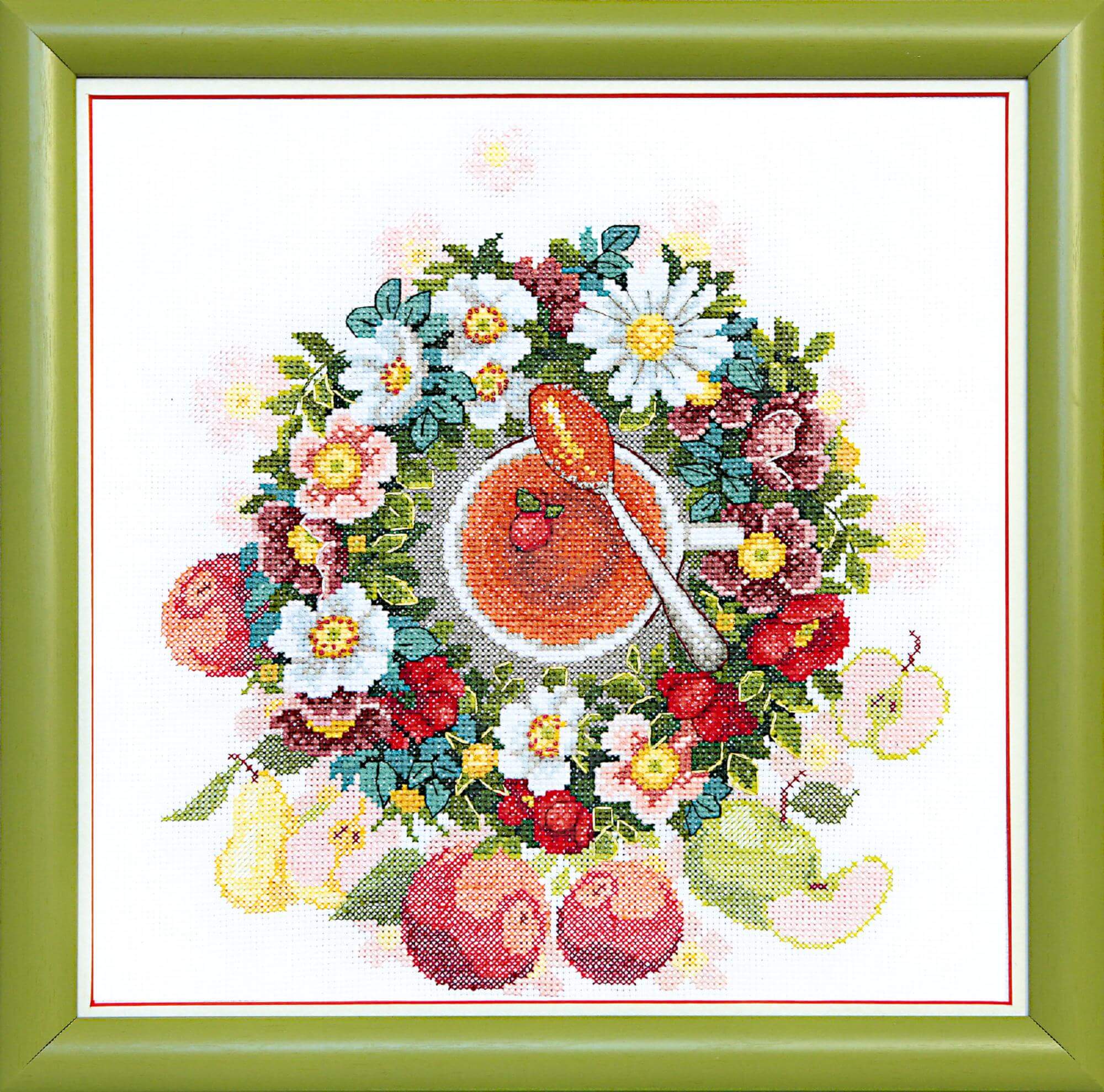 Набор для вышивания крестом Летний чай содержит подробную инструкцию и цветную символьную схему, канву Aida 14, х/б мулине Bestex - 28 цветов и иглу.