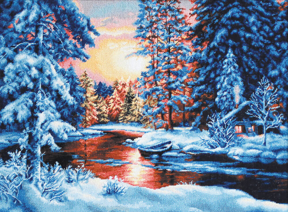 Набор для вышивки крестом Зимний пейзаж компании Luca-S содержит изображение готовой работы, схему, мулине Anchor, канву Zweigart, иглу и инструкцию на русском языке.