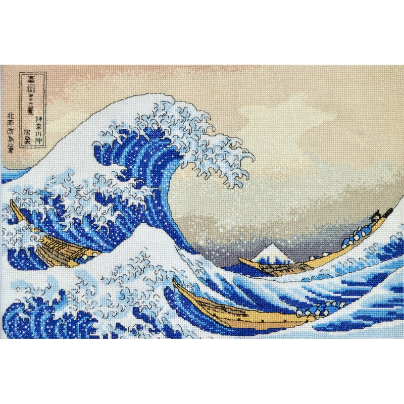 В состав набора для вышивки крестом Большая волна киевского производителя Повитруля входит белая канва Aida 14, мулине Peri, цветная схема и игла.