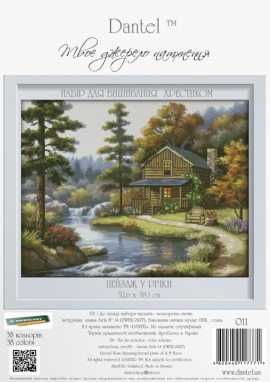 Набор для вышивания крестом Домик у реки ТМ Dantel содержит мулине ПНК им. Кирова, канву Aida 14, символьную схему, иглу и инструкцию.