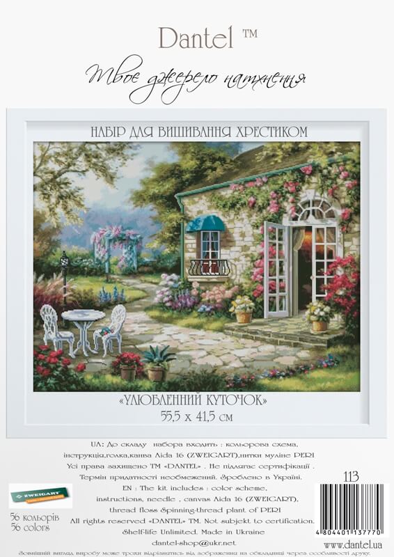 Набор для вышивания крестом Любимый уголок ТМ Dantel содержит мулине DMC, канву Aida 16, символьную схему, иглу и инструкцию.