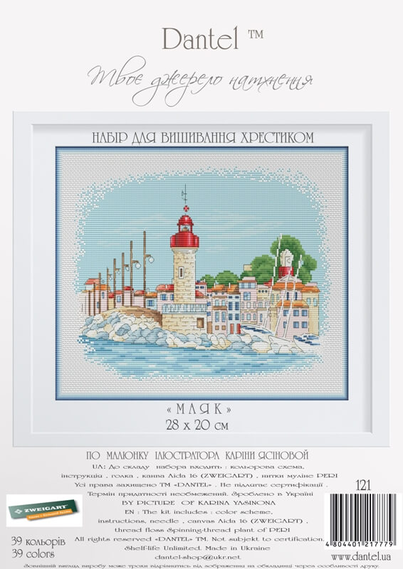 Набор для вышивания крестом Маяк ТМ Dantel содержит мулине DMC, канву Aida 16, символьную схему, иглу и инструкцию.