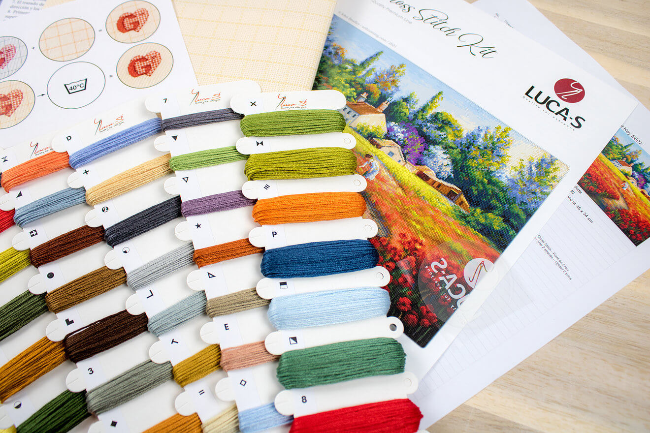 Набор для вышивки счетным крестом Незабываемое (B607) компании Luca-S содержит изображение готовой работы, схему, мулине Anchor, канву Zweigart Aida 18 ct. (цвет 2169), иглу и инструкцию на русском языке.