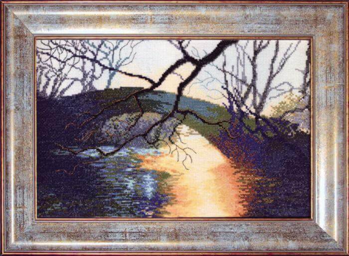 В набор для вышивки крестом Отблески заката (размер вышивки 33.5x21см), арт. 391, ТМ Чарівна мить входит канва Aida 14, мулине ПНК им. Кирова, игла, цветная символьная схема и инструкция.