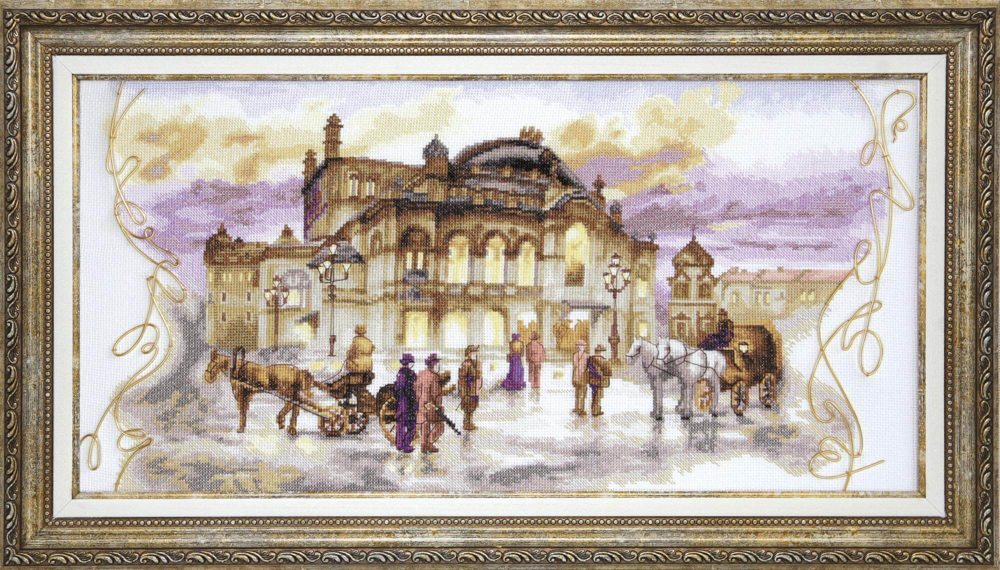 Набор для вышивания Театральный вечер содержит подробную инструкцию вместе с цветной символьной схемой, канву Aida 14, нитки мулине Madeira - 32 цв., проволоку - 1 цвет и иглу. Размер вышивки 53х26см.