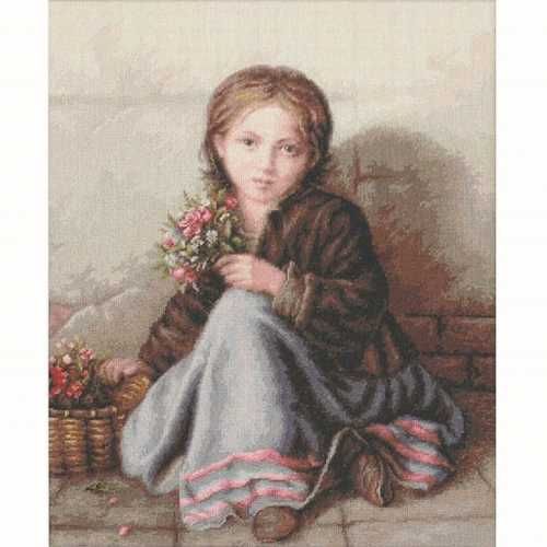 Набор для вышивки счетным крестом Девочка с цветами (B513) компании Luca-S содержит изображение готовой работы, схему, мулине Anchor, канву Zweigart Aida 18, иглу и инструкцию на русском языке.