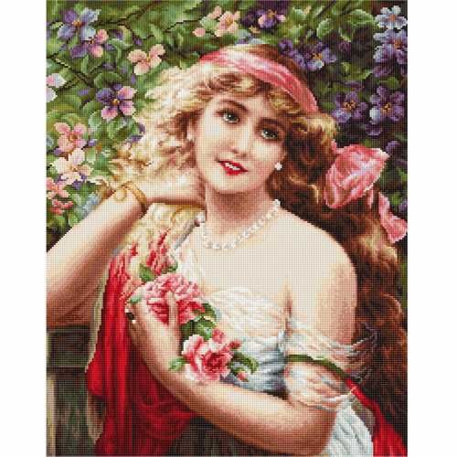 Набор для вышивки счетным крестом Девушка с розами (B549) компании Luca-S содержит изображение готовой работы, схему, мулине Anchor, канву Zweigart Aida 18, иглу и инструкцию на русском языке.