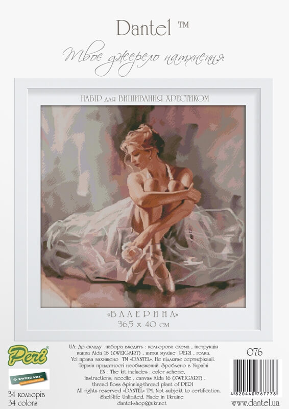 Набор для вышивания крестом Балерина ТМ Dantel содержит мулине PERI, канву Aida 16, символьную схему, иглу и инструкцию.